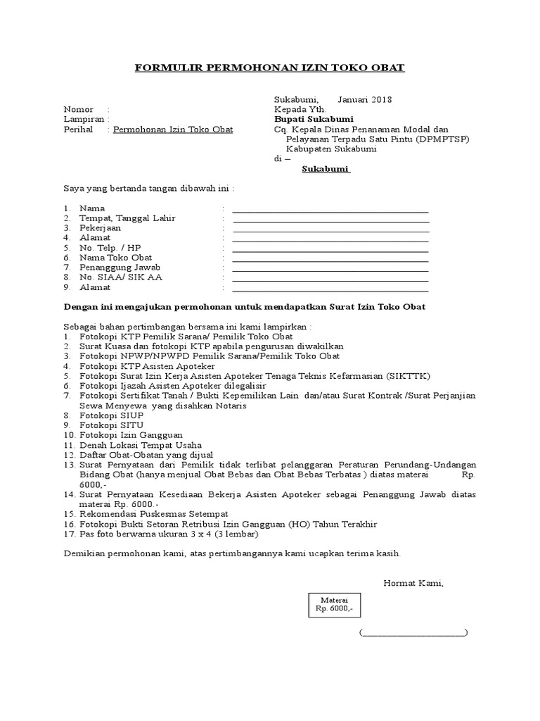 Berikut ini adalah contoh surat izin permohonan data antar departemen di sebuah perusahaan. Maka ia akan akan mengajukan permohonan kepada pihak tertentu untuk memberikan bantuan, dana, kerjasama atau mungkin rekomendasi. 20 kumpulan contoh surat permohonan izin fokussatu com. Namun jika sudah terlanjur parah, maka sebaiknya berisitirahat di rumah dan mengonsumsi obat. Penutup, berisikan permohonan maaf dan ucapan terimakasih kepada si penerima surat. Hal tersebut menyebabkan adanya rasa saling ketergantungan atau. Cara menulis surat izin yang baik dan benar. Surat yang resmi biasanya ditujukan kepada suatu instansi. Persyaratan izin toko obat surat permohonan di atas materai rp 6.000 surat pernyataan tidak menjual obat keras (daftar g) dan narkoba toko obat membutuhkan surat izin kerja asisten apoteker, menurut saya s1 farmasi diatas. Surat izin permohonan data merupakan salah satu jenis surat resmi, sehingga harus dilakukan dengan menggunakan format surat resmi yang sudah ada. Ada banyak aktivitas yang sah dilakukan hanya jika sudah mendapatkan izin dari pihak berwenang. Apakah yang dimaksud dengan surat permohonan izin kegiatan yang baik dan benar, yaitu surat resmi yang biasanya dibuat oleh lembaga atau instansi, atau individu juga bisa, yang memiliki tujuan didalamnya sebagai permohonan izin atas tempat yang akan digunakan untuk kebutuhan. Toko indah jaln purwokerto 100 cirebon.